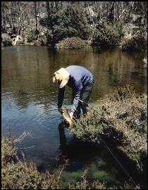In the last few years, stockings of large Atlantic salmon and small brook trout have yielded good bags to all types of fishing during spring at Tungatinah Lagoon, Lake Binney and Bradys Lake, Trolling is popular throughout the season. Weedy edges are hot spots. This chain of lakes rewards fly fishermen who use polaroids to sight gum beetle or jassid feeders from vantage points such as boats and logs. |